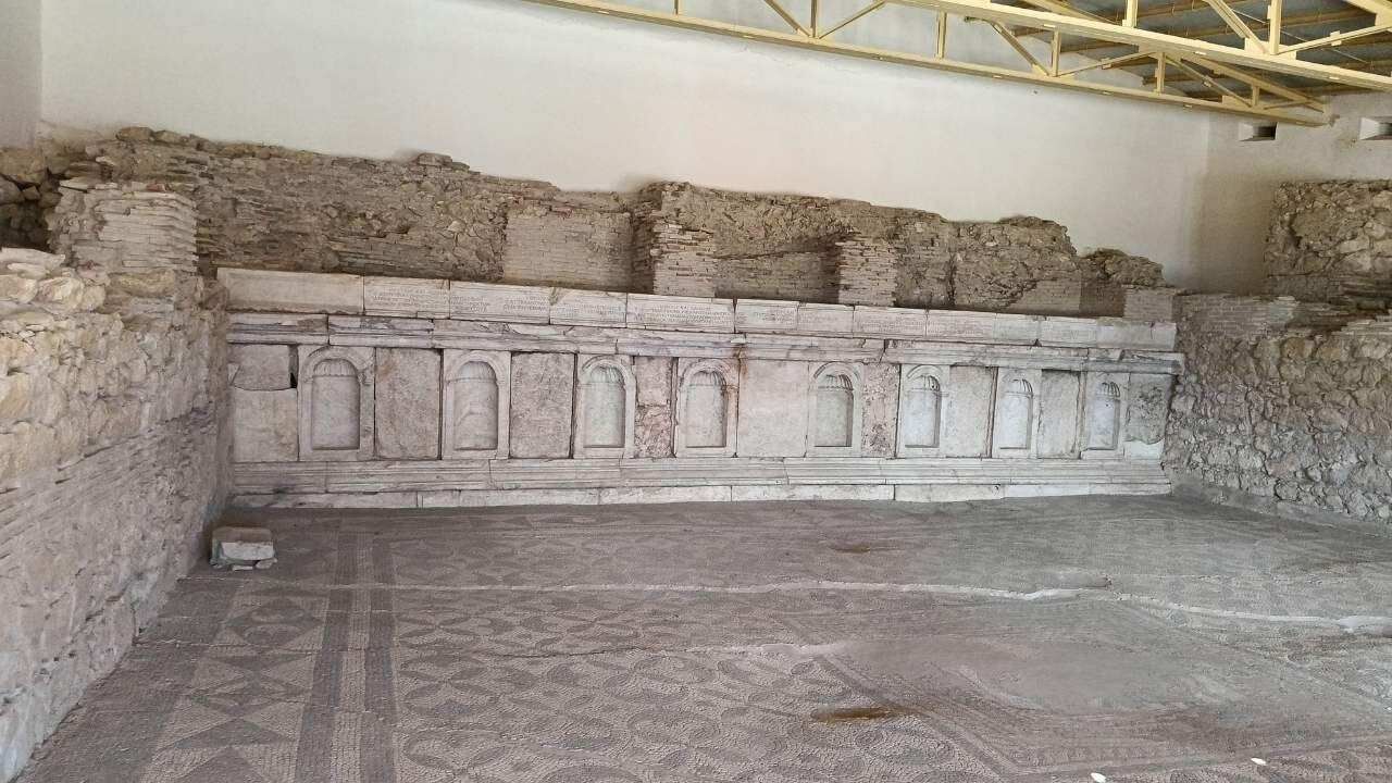“Şu anda bulunduğumuz yerimiz Neon Kütüphanesi olarak geçmekte. Artık Çömlekçiler, yani Sagolosos'un Çömlekçiler Mahallesi'nin Neon Kütüphanesi içerisinde bulunmaktayız. Biraz önce bahsetmiştim aşağıda, Sagolosos iki defa büyük deprem atlatmış ve şehir komple yerle bir olmuş diye. En büyük göstergesi, Fay hattının geçtiğinin en büyük göstergesi karşıdaki zeminde. Neon Kütüphanesi Kültür Turizm Bakanlığı tarafından tamamen korunan ve rehber eşliğinde kapısı açılan bir yer. Karşıda görmüş olduğunuz alan tamamen orijinal. Aşağıda da bahsetmiştim, hemen ortasında bir resim var. Ama Bizans dönemi, muhtemel Selçuklu döneminin içerisinde çalındığı düşüncesiyle Troya Savaşı olarak adlandırılan bir savaşı anlatıyor. İçerisinde bir kadının iki tane asker ve bir at arabasının olduğu düşünülen bir resim. Şu anda nerede bilmiyoruz biz de. Neon Kütüphanesi iki katlı bir kütüphane. İki katlı kütüphanenin birinci katını görmektesiniz şu anda.