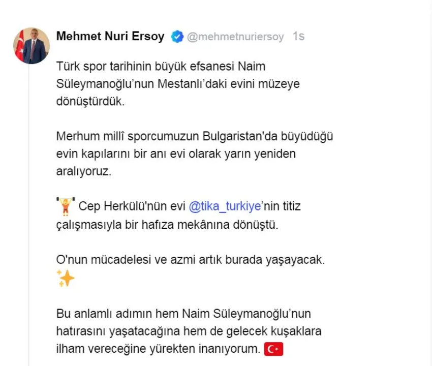 "Türk spor tarihinin büyük efsanesi Naim Süleymanoğlu'nun Mestanlı'daki evini müzeye dönüştürdük. Merhum milli sporcumuzun Bulgaristan'da büyüdüğü evin kapılarını bir anı evi olarak yarın yeniden aralıyoruz. Cep Herkülü'nün evi Türk İşbirliği ve Koordinasyon Ajansı Başkanlığı'nın (TİKA) titiz çalışmasıyla bir hafıza mekanına dönüştü. O'nun mücadelesi ve azmi artık burada yaşayacak. Bu anlamlı adımın hem Naim Süleymanoğlu'nun hatırasını yaşatacağına, hem de gelecek kuşaklara ilham vereceğine yürekten inanıyorum"