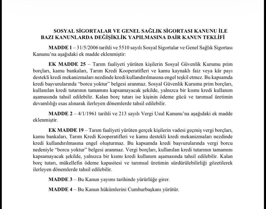 Kanun teklifinin gerekçesinde; artan girdi maliyetleri, yüksek enflasyon ve finansmana erişimde yaşanan sıkıntılar nedeniyle çiftçilerin ciddi bir ekonomik darboğaz içinde olduğu vurgulandı. Mevcut uygulamada, üreticilerin Sosyal Güvenlik Kurumu prim borçları ile vadesi geçmiş vergi borçları gerekçe gösterilerek kamu bankaları, Tarım Kredi Kooperatifleri ve kamu destekli kredi mekanizmalarına fiilen erişemediği belirtildi. Bu durumun üretimin durma noktasına gelmesine yol açtığı ifade edildi.