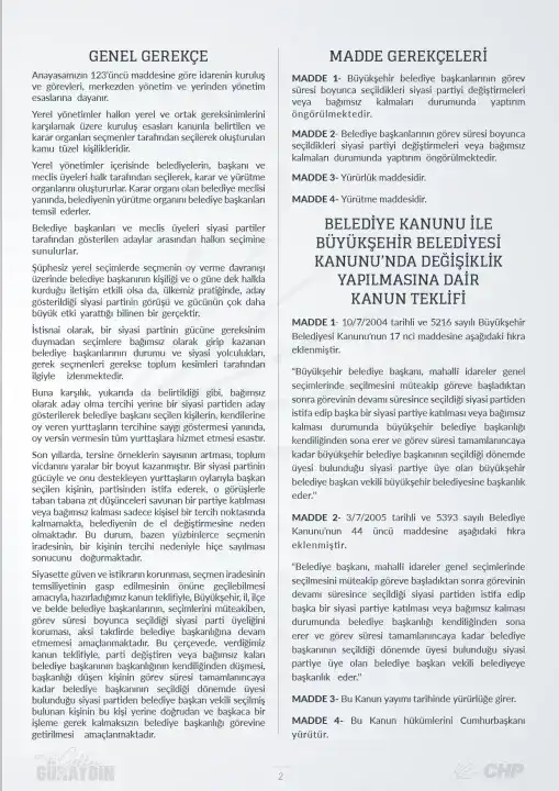CHP Grup Başkanvekili Gökhan Günaydın, belediye başkanlarının başka partilere geçişini önlemeye yönelik hazırlanan kanun teklifini Türkiye Büyük Millet Meclisi’ne sundu. Son dönemde birçok belediye başkanının seçildikleri partiden ayrılmasının kamuoyunda rahatsızlık yarattığını belirten Günaydın, teklifin seçmen iradesini korumak amacıyla hazırlandığını ifade etti.