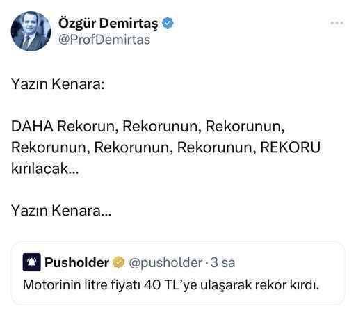 Motorinin litre fiyatı 40 TL’ye ulaşarak rekor kırdı. Özgür Demirtaş ise bu rekorların henüz hiçbirşey olmadığını belirterek: