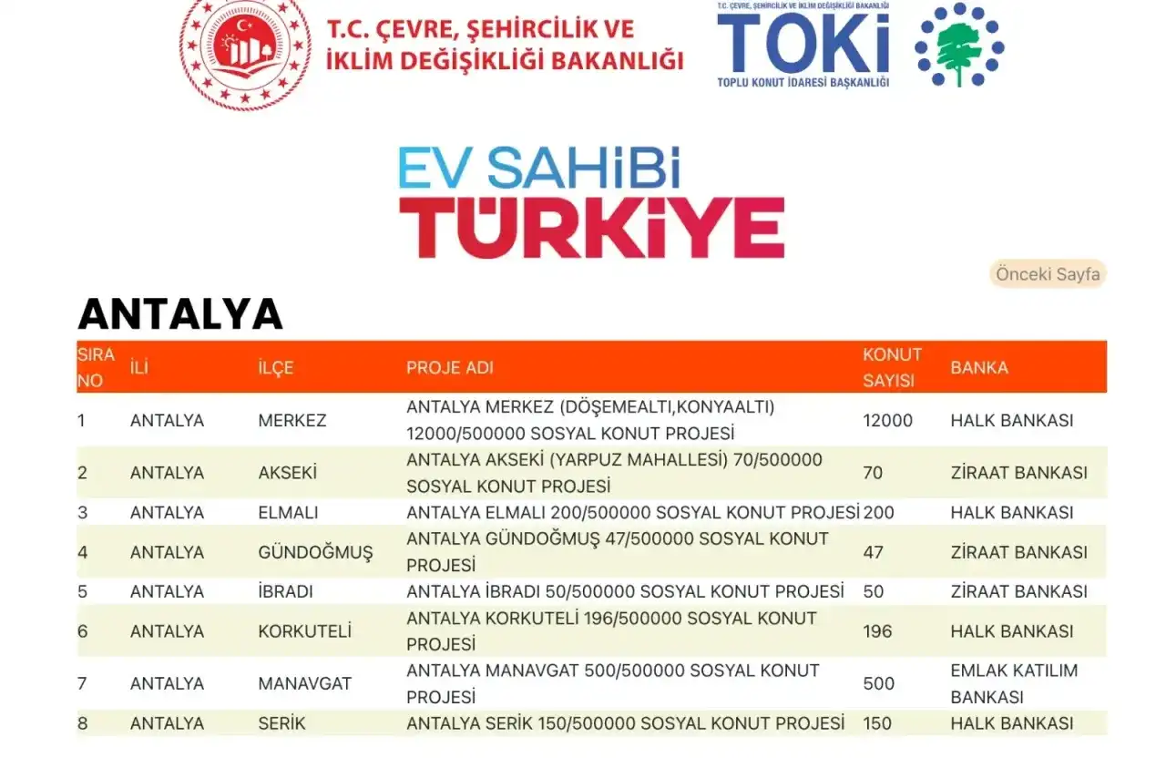 | 8 | ANTALYA | SERİK | ANTALYA SERİK 150/500000 SOSYAL KONUT PROJESİ | 150 | HALK BANKASI |