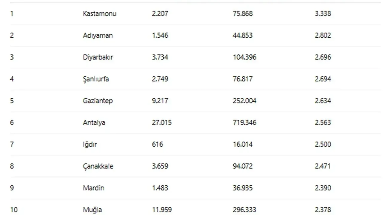 En az artış yaşayan iller