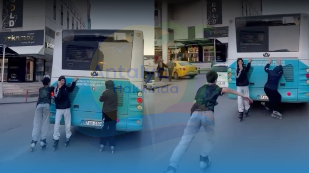 Olay, akşam saatlerinde Antalya'da kent merkezinde meydana geldi. Patenli gençlerin, hareket halindeki otobüsün arkasına tutunarak ilerlediği anlar, çevredeki bir vatandaşın cep telefonu kamerasına yansıdı. Görüntülerde gençlerin, trafikte ilerleyen otobüsün arkasında metrelerce yol kat ettiği görülüyor.
