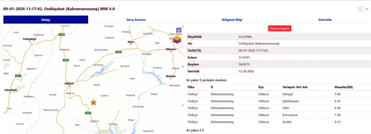 Afet ve Acil Durum Yönetimi (AFAD) Başkanlığı verilerine göre saat 11.17’de merkez Onikişubat ilçesinde 4 büyüklüğünde deprem oldu. Yerin 12,36 kilometre derinliğinde meydana gelen depremde, ilk bilgilere göre herhangi bir binada hasar veya olumsuzluğun yaşanmadığı belirtildi.
