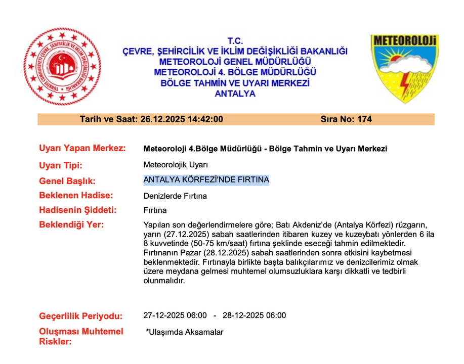 "Yapılan son değerlendirmelere göre; Batı Akdeniz’de (Antalya Körfezi) rüzgarın, yarın (27.12.2025) sabah saatlerinden itibaren kuzey ve kuzeybatı yönlerden 6 ila 8 kuvvetinde (50-75 km/saat) fırtına şeklinde eseceği tahmin edilmektedir. Fırtınanın Pazar (28.12.2025) sabah saatlerinden sonra etkisini kaybetmesi beklenmektedir. Fırtınayla birlikte başta balıkçılarımız ve denizcilerimiz olmak üzere meydana gelmesi muhtemel olumsuzluklara karşı dikkatli ve tedbirli olunmalıdır."
