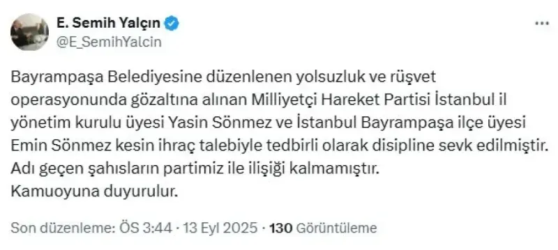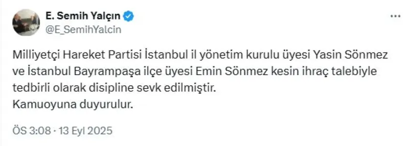 MHP'li Yalçın, sosyal medya hesabından yaptığı açıklamada, "Milliyetçi Hareket Partisi İstanbul İl Yönetim Kurulu üyesi Yasin Sönmez ve İstanbul Bayrampaşa İlçe üyesi Emin Sönmez, kesin ihraç talebiyle tedbirli olarak disipline sevk edilmiştir" ifadelerini kullandı.