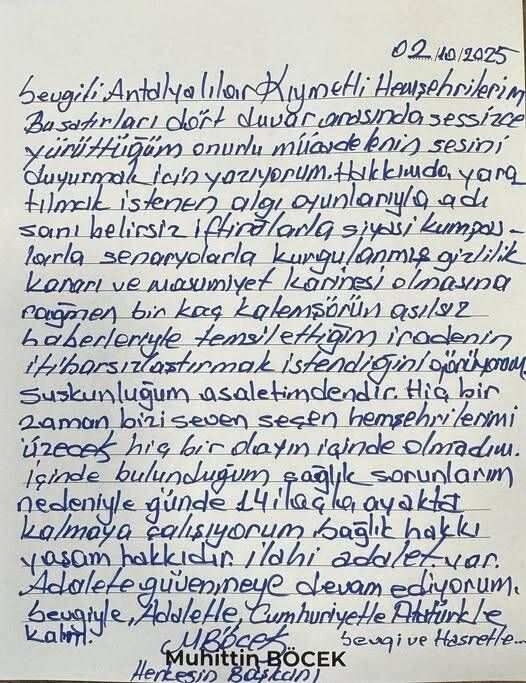 "Sevgili Antalyalılar, kıymetli hemşehrilerim, Bu satırları dört duvar arasında sessizce yürüttüğüm onurlu mücadelenin sesini duyurmak için yazıyorum. Hakkımda yaratılmak istenen algı oyunlarıyla, adı sanı belirsiz iftiralarla, siyasi kumpaslarla, senaryolarla kurgulanmış, gizlilik kararı ve masumiyet karinesi olmasına rağmen birkaç kalemşörün asılsız haberleriyle temsil ettiğim iradenin itibarsızlaştırmak istendiğini görüyorum.