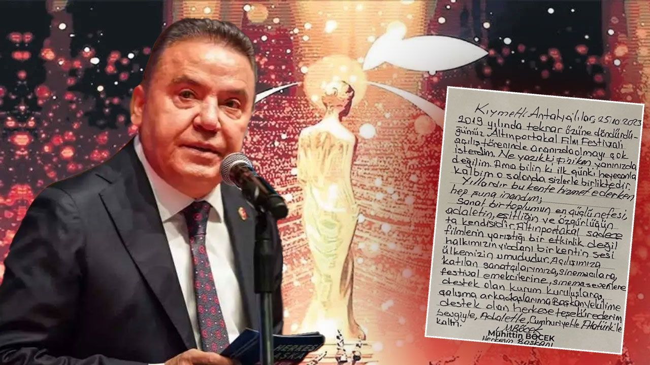 Antalya Cumhuriyet Başsavcılığı'nın 'rüşvet' soruşturması kapsamında 5 Temmuz günü gözaltına alındıktan sonra tutuklanan ardından da geçici olarak Büyükşehir Belediye Başkanlığı görevinden uzaklaştırılan Muhittin Böcek, bulunduğu Döşemealtı L Tipi Ceza İnfaz Kurumu’ndan 62'nci Uluslararası Antalya Altın Portakal Film Festivali'ne dair yeni bir paylaşım yaptı.
