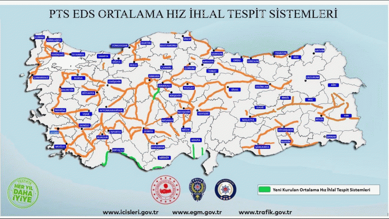 PTS ve EDS tabanlı ortalama hız ihlal tespit sistemi haritası da kamuoyuyla paylaşıldı. Yeni sistem sayesinde sürücülerin ortalama hızları ölçülecek ve yasal hız sınırlarına uymayan araçlar tespit edilecek.