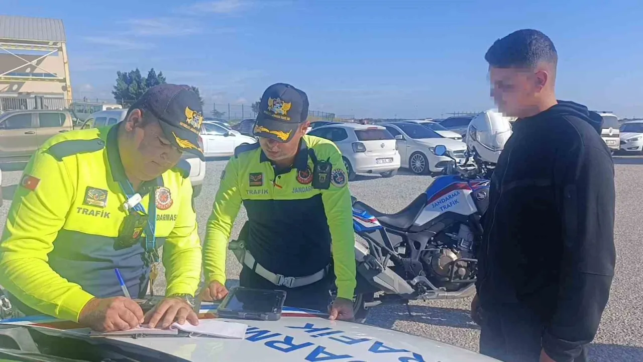 Ceza uygulanan sürücülerden A.C.’nin jandarma trafik ekiplerinin dur ihtarına uymadığı, kaçmak isterken düşmesi sonucunda durdurulduğu bildirildi. A.C’ye ehliyetsiz araç kullanmak, abartılı egzoz, plaka takmamak, ayna takmamak ve dur ihtarına uymamaktan toplam 66 bin 677 TL para cezası uygulanırken motosikleti de trafikten men edilerek yediemin otoparkına çekildi.